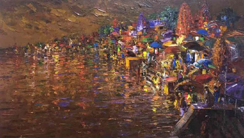 ...The painting features a lively riverside scene with a multitude of figures engaged in various activities. The foreground showcases a wide river, reflecting a kaleidoscope of colors from the sky and surroundings. On the left, a series of boats line the water's edge, while the right side reveals a bustling marketplace with vibrant umbrellas in shades of red, pink, and purple. The background is dominated by colorful buildings and temples, under a sky filled with swirling blues and soft whites, suggesting a late afternoon light. The texture is rich, with thick, expressive brushstrokes adding depth and movement to the scene.