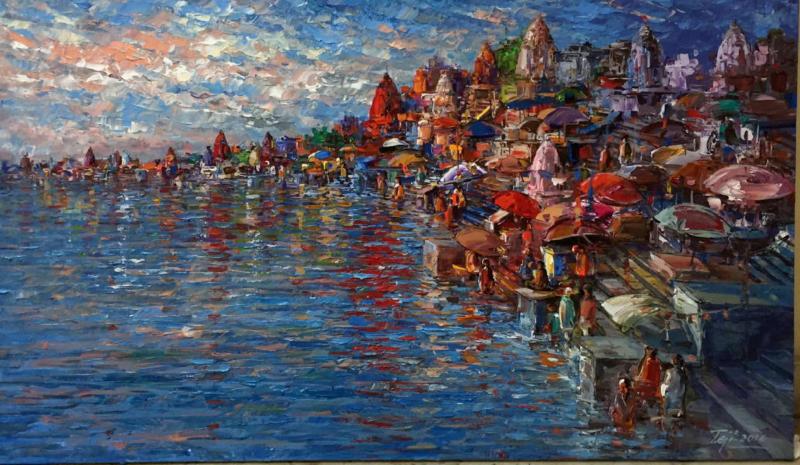 ...The painting features a lively riverside scene with a multitude of figures engaged in various activities. The foreground showcases a wide river, reflecting a kaleidoscope of colors from the sky and surroundings. On the left, a series of boats line the water's edge, while the right side reveals a bustling marketplace with vibrant umbrellas in shades of red, pink, and purple. The background is dominated by colorful buildings and temples, under a sky filled with swirling blues and soft whites, suggesting a late afternoon light. The texture is rich, with thick, expressive brushstrokes adding depth and movement to the scene.