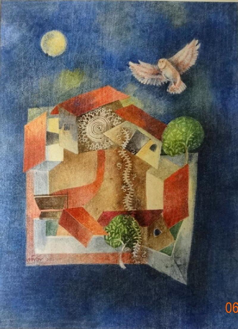 ...The painting features an abstract landscape dominated by geometric shapes representing houses, arranged in a spiral pattern. The background is a deep blue, suggesting a twilight sky, with a bright yellow moon illuminating the scene. An owl is depicted in flight above the village, adding a sense of motion. Lush green trees flank the composition, contrasting with the warm reds and earthy tones of the structures. The texture of the watercolor enhances the vibrancy of the colors, while the overall arrangement creates a harmonious balance between the elements.
