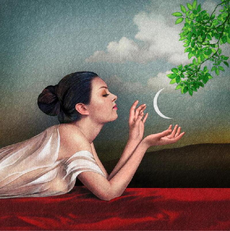 ...The painting features a young woman reclining on a vibrant red surface, her body turned slightly to the side. She has long, dark hair styled in a bun and wears a flowing white garment that drapes softly over her shoulder. Her hands are gracefully extended towards a small crescent moon, which glows softly in the upper right corner. The background transitions from a deep green at the bottom to a soft, cloud-strewn sky above, hinting at twilight. To the left, a lush green branch reaches into the scene, adding a natural element and framing the figure. The overall composition conveys serenity and contemplation.