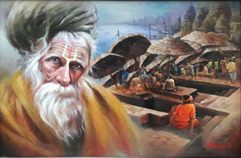 ...The painting features a prominent elderly man with a long white beard and a thoughtful expression, dressed in a vibrant orange and yellow robe. His face is detailed, with soft shadows emphasizing his wrinkles. Behind him, a bustling riverside scene unfolds, with people engaged in various activities, some seated under large umbrellas. The background shows the Ganges River, with faint temple structures and hills in soft focus. The color palette includes earthy browns, warm yellows, and cool blues, creating a harmonious yet dynamic atmosphere. The light appears warm, suggesting a late afternoon setting.