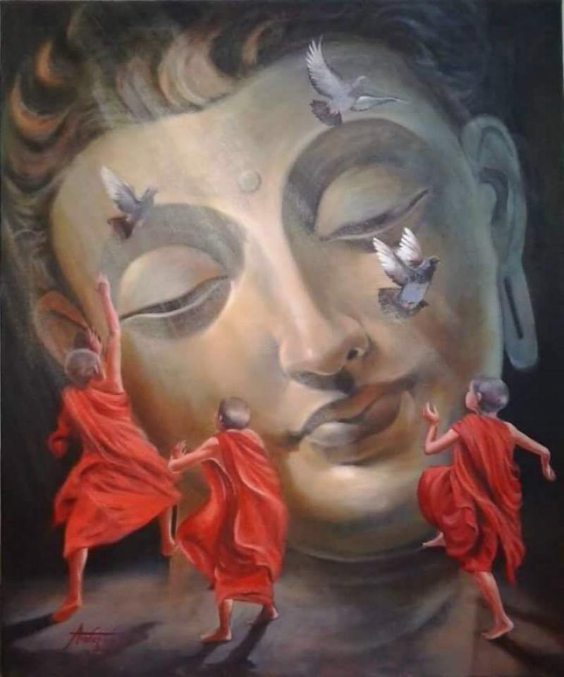 face  painting  art  head  modern art  portrait  artwork  visual arts  acrylic paint  visual arts  modern art  acrylic paint  portrait  art  anuradha haldar buddha painting  monk art  spiritual expression  dance theme  red robes  peaceful imagery  contemporary art  oil painting  symbolic art  ethereal beauty This captivating painting invites viewers into a realm where spirituality meets vibrant energy. The serene visage of a Buddha, rendered with exquisite detail, serves as a backdrop to the dynamic movements of young monks. Clad in flowing red robes, they dance joyously, embodying a harmonious blend of tradition and modernity. The gentle presence of doves adds an ethereal quality, symbolizing peace and freedom. This artwork captures the essence of inner tranquility while celebrating the exuberance of life. This painting bears resemblance to works by artists like Paul Gauguin and Gustav Klimt, who also blend figures with spiritual themes. The use of vibrant colors, particularly the red robes, evokes a sense of emotional depth similar to Gauguin's explorations of culture. The peaceful yet dynamic composition recalls the serene faces found in Klimt's portraits, where color and pattern play essential roles in conveying emotion.