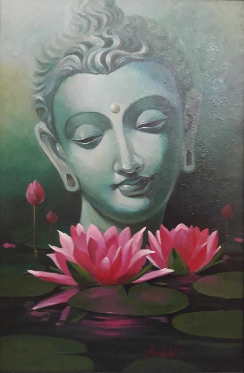 painting  flower  art  modern art  watercolor paint  acrylic paint  portrait  visual arts  paint  artwork  visual arts  still life  still life photography  modern art  watercolor painting  anuradha haldar buddha art  lotus flowers  spiritual painting  calm colors  oil on canvas  meditative art  contemporary art  nature theme  eastern philosophy  tranquil landscape Immerse yourself in tranquility with this captivating oil painting that beautifully marries the serene visage of a Buddha with the delicate grace of lotus flowers. The soft greens and vibrant pinks create a harmonious balance, inviting introspection and peace. Ideal for collectors who appreciate spiritual art, this piece evokes a sense of calm while enhancing any modern or traditional space. Let the soothing imagery transport you to a realm of mindfulness and serenity. This painting evokes similarities to works by Claude Monet, particularly his water lily series, where the interplay of light and color creates a dreamlike quality. The serene mood and focus on nature also draw parallels to traditional Japanese art featuring lotus flowers, emphasizing tranquility and beauty in simplicity. Both styles reflect a deep appreciation for the natural world and spiritual themes.