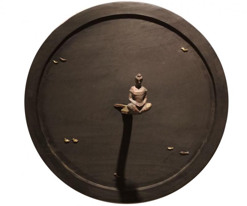 ...The artwork features a circular panel with a dark, matte surface that creates a sense of depth and mystery. In the center, a sculpted figure sits in a meditative pose, rendered in a lighter material that contrasts with the background. Surrounding the figure are small, scattered elements that resemble seeds or stones, adding a tactile quality. The lighting highlights the figure, casting a soft shadow that enhances the overall sense of solitude. The composition emphasizes simplicity and balance, encouraging a meditative response from the viewer.