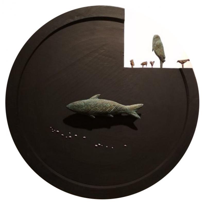 ...The sculpture is set within a circular frame, predominantly featuring a matte black background that enhances its minimalist aesthetic. A textured fish, crafted in a greenish hue, rests at the lower center, surrounded by small white dots that suggest movement or ripples. Above the fish, several slender birds emerge, positioned asymmetrically to create a sense of height and depth. The overall composition balances the heavier fish with the delicate forms of the birds, illuminated by soft lighting that accentuates the textures of each element.