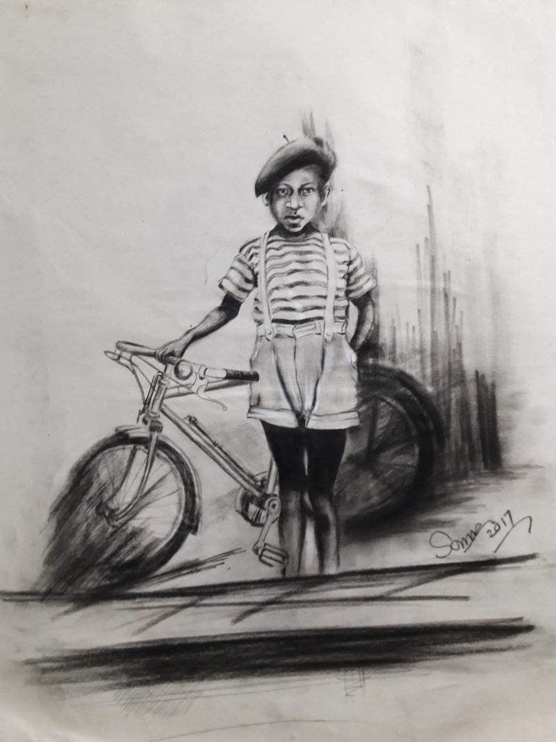 bicycle  black and white  drawing  art  artwork  sports equipment  portrait  bicycle accessory  sketch  visual arts  visual arts  black and white  portrait  sketch  bicycle  rajesh bahadur roy (samm) childhood  urban art  charcoal drawing  innocence  bicycle  figurative art  nostalgia  portrait  black and white  street life This captivating artwork captures the essence of childhood through the figure of a young boy with a bicycle. The artist skillfully employs charcoal to evoke a sense of nostalgia and innocence. The boy's confident stance, dressed in a striped shirt and suspenders, invites viewers to reflect on the joys of youth. The urban backdrop hints at a world of adventures waiting to be explored, making this piece a poignant reminder of the simplicity and freedom that defines childhood. This artwork evokes similarities to the works of artists like Jean-Michel Basquiat and Keith Haring, whose styles also reflect urban themes and youthful energy. The use of monochromatic tones and a focus on youthful figures resonates with Basquiat's expressive, raw lines and Haring's vibrant yet simplistic forms, highlighting themes of innocence and the urban experience.